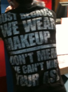 Ultimately cocky. Grammatically incorrect. Telling. I guess when you’re young, smallish, living with your parents, you’ve gotta wear statements that enhance your intimidation factor. But think about it. With his friend standing right there, I stepped up to him and took this picture.