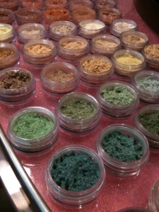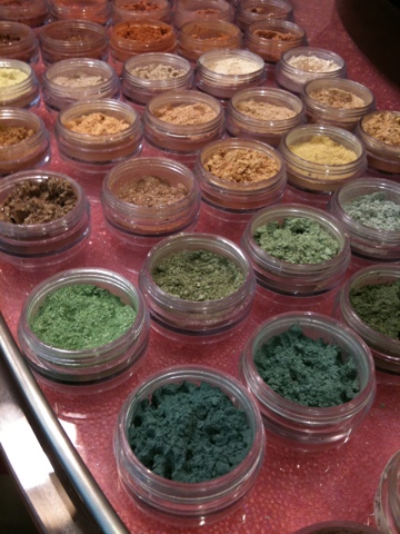 Friday I went to the Bare Escentuals store at Ala Moana Center to get some new stuff. There were two women working there, and a guy, who was clearly into makeup and probably not into girls. So that’s cool, right? I was in awe of the way the powdered products are displayed, especially the eye shadows. My favorite colors were always greens and sands and browns and purples. I don’t wear them much anymore. Some of these colors looked amazingly rich and I felt they would probably be wrong for me. But I took a photo because it was so pretty.
