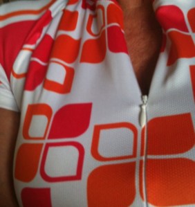 After Japan’s earthquake and resultant tsunami, I was eager for a normal Saturday. I woke up a little early and got ready for a ride. Earlier this week my package from realcyclist.com showed up with three jerseys. Today I wore one that looks kinda retro ’70s, an orange and hot pink abstract on a white background. You’d be tempted to ask me about the in-flight movie.