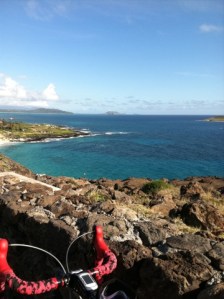 At the top of my second hill today, Makapu’u, I was pretty shaky as I got off my bicycle. My routine is to take a picture, have some water, and get back on the bicycle. Today there was a woman who arrived just as I did but from the opposite direction. I say hello.