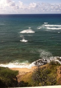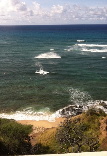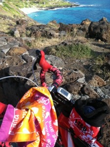 Wrapped up my Easter ride by 9:45 this morning, pulling into the driveway minutes before John returned from his Honolulu Marathon Clinic session. I win! Haha. I did the hills, and it was a little hard today, but I think Kamiloiki is harder than Makapu’u. I’m not sure why. I’m just not dying as much when I get to the top of Makpu’u. Took my pics, kept going. I lucked out this weekend. Both times I’ve launched from Makapu’u, there’s been no traffic and I’ve had the whole lane to myself to go flying down like a 10-year-old kid who is in a hurry to get home to a grilled cheese sandwich and tomato soup lunch and some cartoons.