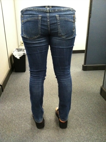 On the weekends, my regular outfit includes bicycle shorts. Not for walking around. For actually riding my bicycle. So I’m familiar with the pour-oneself-int0-a-pair-of-tightness-and-jump-up-and-down-to-get-all-the-seams-and-stuff in the right place. I also know well, appreciate, and deeply value the 2-percent Spandex content in jeans. It keeps them from sagging in the butt. It keeps them up. It keeps the butt up, somewhat. And admittedly, I have large calves that could crack walnuts, so a tight fit all the way down my leg is uncomfortable. I should mention I love my boot cut Levis.