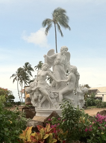 I had my own tickle-my-funny-bone Kodak moment today, too. In fact, I even turned around and went back to take a picture with my iPhone. My iPhone camera was acting up so I stood there and restarted my iPhone4 and snacked on some pretzels while calmly waiting. A brand new statue was installed yesterday at a property where I see Gensiro Kawamoto nearly every weekend, bobbing around under his giant blue Halekulani Hotel umbrella. A touch of class for Kahala. I’m sure the well-heeled neighbors gasped in unison upon discovering the installation. There’s room for more. I’m willing to bet there will be additional naked cherubs and scantily clad angels, with their darling little nether regions exposed. I just wonder if this is a kooky guy’s way of saying “Nuts to you!”