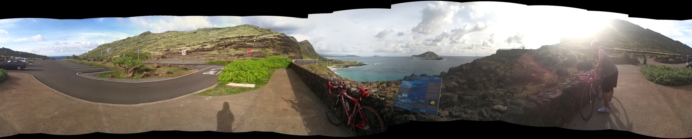 When I got to Makapu’u this morning, I decided to try taking a surround photo with Microsoft’s Photosynth on my iPhone. While I was shooting, this guy comes up and he ends up being in my picture. Poor dude was huffing and puffing like I do! Then he says hi to me! It’s David, who is married to my HMSA colleague and Facebook friend Kari Lum! So he took my picture, too, and I hope wearing slimming black paid off!
