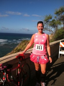 Today at Diamond Head Lookout I was asked by a woman who was participating in the Hibiscus Half Marathon if I would take her picture. I said, sure, but she’d have to pose with my bicycle the Scatt! She did and she told me what she was doing. Melissa Johnson, she of the Pink Ribbon Tutu, is a travel agent from Florida. She told me she was in Hawaii assessing hotel properties for her clients. This sort of research coincides nicely with her mission to do 12 half marathons in 12 months around the country (subject to lengthen as she is starting to enjoy herself and sees more events on the horizon she’d like to take on), in an effort to promote breast cancer awareness and its research. After I took her photo with her phone, I made her pose with the Scatt for my phone, and I told her I would put her in my blog today.