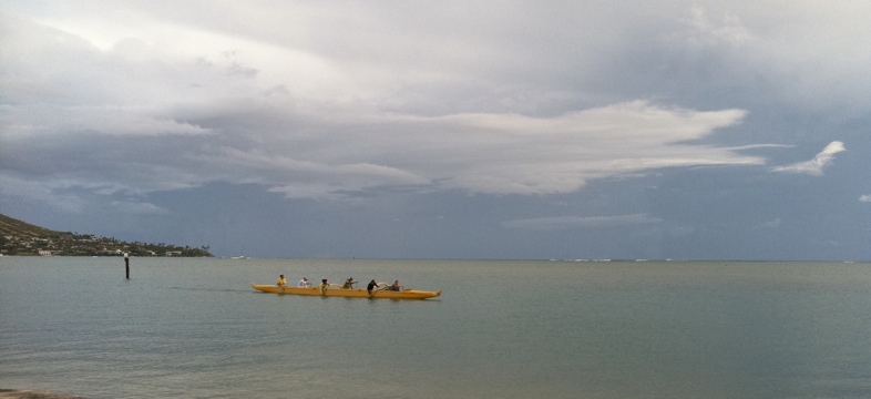 Wahine paddlers on a glassy Maunalua Bay on a under storm clouds.