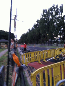 This morning I woke up early, the same time I get up for work, to ride my bicycle at the butt-crack of dawn to see the start of Hawaii’s Tinman triathlon event at 5:45 a.m. My ride in Hawaii Kai was already coned off but I passed the cone truck on Kalanianaole Highway before Maunalua Bay, so I was extra careful on the way to Waikiki. Along the Waialae Country Club golf course, I encountered no cars, and none passed me on Kahala Avenue until I was approaching Black Point. Then, while on Diamond Head Road, there was some punks-in-hot-rods stupidity going on at the lookouts. I expected to get harassed, especially when the BMW driver turned his lights on as I passed, but they didn’t bother with me. Thank goodness.