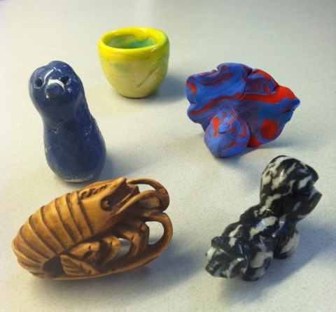 A blue penguin, a tiny bowl, a turkey made by Kid2. A shrimp and a skunk.