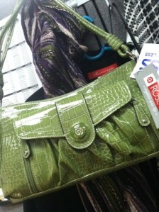Yesterday I found what I think will work. It’s green and shiny, so it will be easy to clean and easy to locate. It has a secure front pocket for keys or a bus pass or both. It has a zippered top, which should help repel unauthorized hands. It’s interior is also green, which will make it easy to find things inside. And it has double medium-length straps, a compromise for not having both handles and a shoulder strap. It’s also small. I am a big-purse goddess, but what that really means is that I sometimes have neck, arm, and back aches because I carry too much in my big black holes.