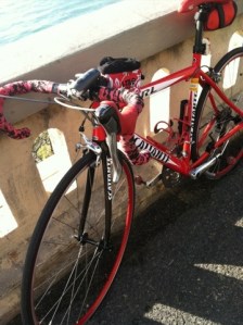 John wanted me to try out my bike before he took off on his run, so I went out and left. He had put new Velocity red Aerohead wheels on it, and replaced the red Conti’s, which we found aren’t very hearty, with black ones. He wanted to be sure the brakes were OK. I had put the Garmin sensor on the rear wheel, and I got it right! But when I launched, I realized that I had forgot to bring my water and my ginger chews, and I didn’t get coffee or breakfast. I had a drink of water at the Kahala Aloha Tesoro station at the water fountains outside the building.