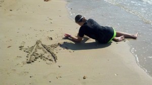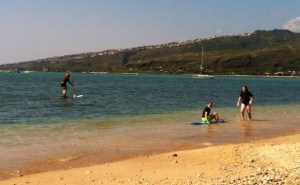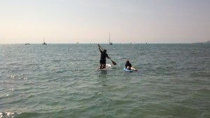 After we set up the chairs, loaded John with the cameras, we Benderettes took to the sea. The girls were happily playing on the new board while I considered what I was about to do. Although I had been on my SUP a handful of times two years ago, I didn’t feel as though I had mastered it even then. So I got on it, first on my knees, and paddled around a little bit, mostly in a circle. A kind gentleman came over to tell John I was holding my paddle wrong. Oh, the logo goes OUT?