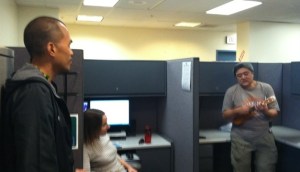 As another colleague serenaded the couple with his ukulele, singing two songs including “Over the Rainbow,” ala Israel “IZ” Kamakawiwoole, I took a photo and then ran over to the other side of the wall to my cube where I just dabbed my eyes until he was done. THEN I got to blow my nose. What the heck? I think my hormones might be part of this emotional symphony as well. Sometimes listening to Iz helps: