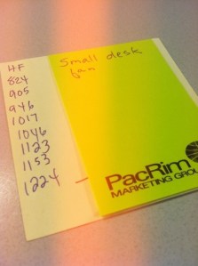 Today I’m focusing on my own little rhythm, the spontaneous steaming that radiates from my chest, arms and face. I’ve been writing down the time each time one happens. Under the heading of “HF” (hot flash), on a little post-it, I’ve put down the times. I don’t really see much of a pattern, yet. It’s been going on for about a month now. I guess it’s rather telling that on the sticky stuck to the post-it is a note to myself to buy a small desk fan.