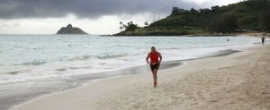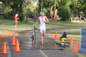 I saw Tim Marr coming back from his bicycle ride, clearly well in the lead. I wasn’t even halfway through with my ride yet! And having never been on Marine Corps Base Hawaii in Kaneohe, I was pleasantly surprised at how nice it was, and struggled up that kick-ass hill with only one foot clicked in one pedal. I managed, through the rain and the wind, through the puddles and one really nasty smashed Budweiser beer bottle. When we got back to the park, we had to get off right before that same speed bump again, and walk/run our bikes to the timing mat, then to our transition areas for the run. I got passed by four people on foot before the mat, four people I had passed on the bike! Ugh! I am so feeble on foot!