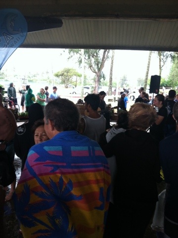 Party after the triathlon. The crowd gathered under the pavilion for food and music before the awards ceremony. And to hide from the weather!