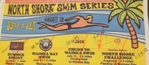 After doing the first three events of the North Shore Swim Series, I was eager to get started for the fourth and final swim from Pipeline to Waimea Bay on Oahu’s North Shore. For those of us who went for this 2.3-mile swim there was the usual T-shirt and these really amazing hats that could have fallen off a Cabela’s truck, although we don’t have Cabela’s in Hawaii.