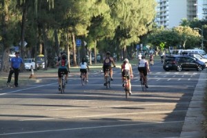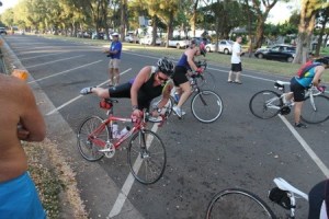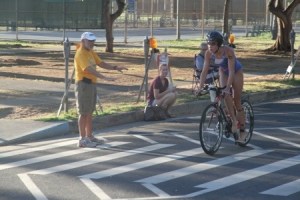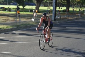 I emerged from the water fifth of 12 in my age group, breathless, heaving as I ran up the beach, across the lawn, across the street, to the bike coral in Kapiolani Park. I rinsed my feet, stuck my goggles, swim cap and earplugs into my backpack, rinsed my feet again and slipped into my bicycle shoes. I put on my singlet, my number belt, my sunglasses, my helmet, and started running with my bike to the bike exit. Whoops. Stopped to Velcro my Sidis. I should have done that while on the bike. Off I went.