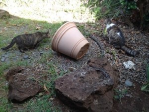 Unfortunately, some feral cats in the know consider the hutch their personal speak easy on the kitty cat map of Hawaii Kai. However, I get the feeling that this cat, who has parked his fuzzy butt in our garage, isn’t feral. In fact, this cat is quite tame. He keeps trying to get in the house and he gives me this look like, “WTPho? I’m an OK guy!” as I quickly close the door at his nose.