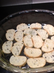 Preheat oven to 375F degrees. Drizzle a pie plate with olive oil and place the bread slices on the bottom to serve as a sort of crust.