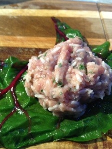 Take each parboil chard leaf and spread it out on a cutting board or other work surface bottom side up. Shape the ground meat-rice mix with hands or an ice cream scoop into balls about 2.5 ounces each. This should yield eight balls. Place the mixture onto the leaf and roll gently, tucking the ends in so it looks like a neat little purse. Arrange the purses on top of the chopped cabbage in the roasting pan.