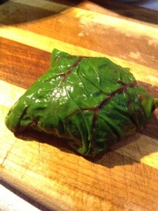 4 Swiss Chard leaves, split in half, stems removed and reserved
