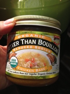 Toss a scoop of “Better than Bouillon” low-sodium chicken stock base and pour in your water, as much as you like to taste. I added a quart or so of water to a big scoop of the base. Bring to a boil.