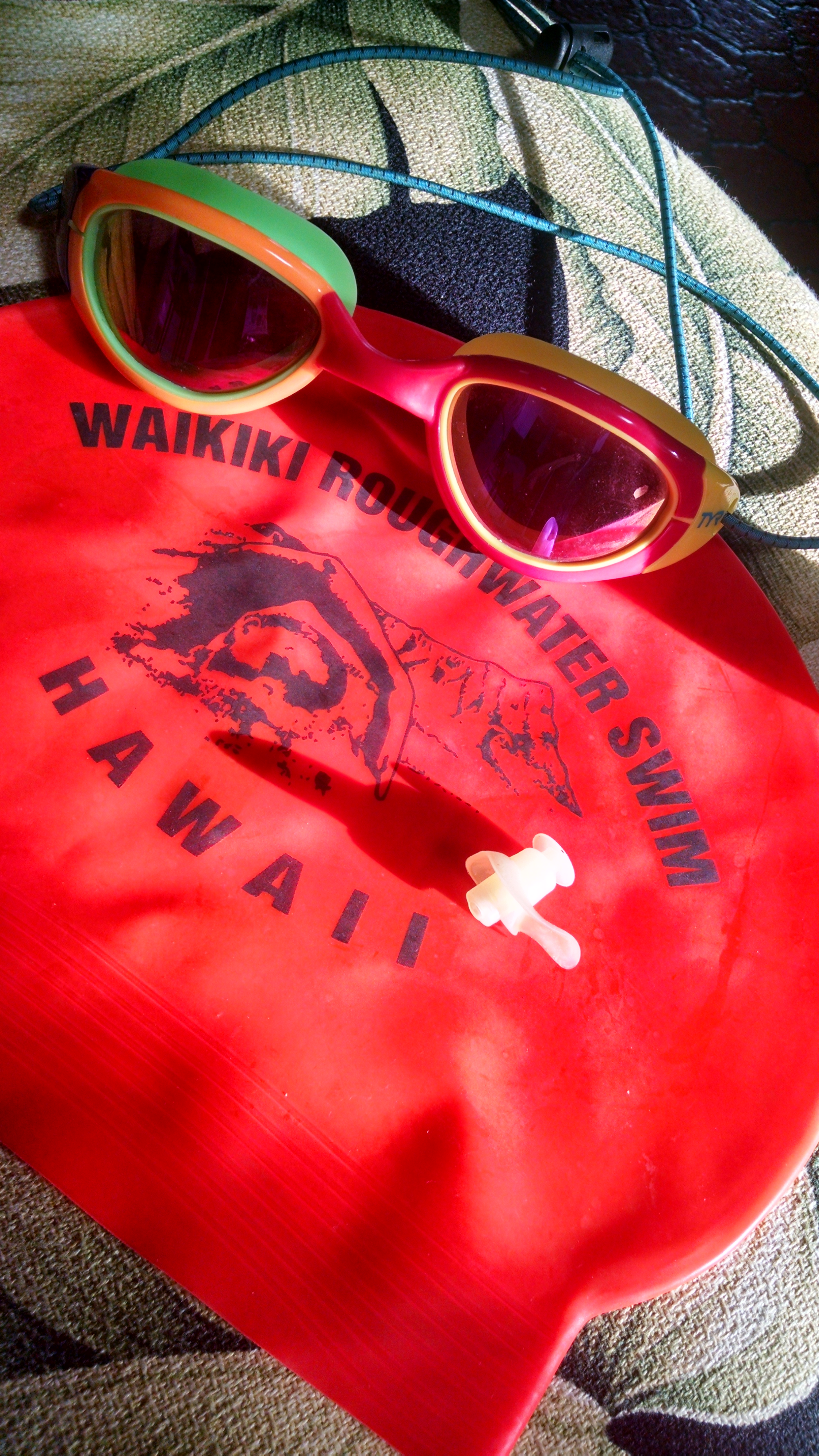 I was craving an ocean fix so bad. I couldn’t go out at Sandy Beach because it was too big. My hair was a big ball of fuzz, and the best remedy for that is an ocean swim. I decided to go for a swim at Kaimana Beach in Waikiki before I had to pick up Kid2 at school. Hot. Hot. Hot. Parking was easy at 1:30 p.m. In fact, if you run the Honolulu Marathon, there were like ZERO cars parked along the finish. The waves are too big on the South Shore for most surfers and definitely not a swim to the windsock kind of day.