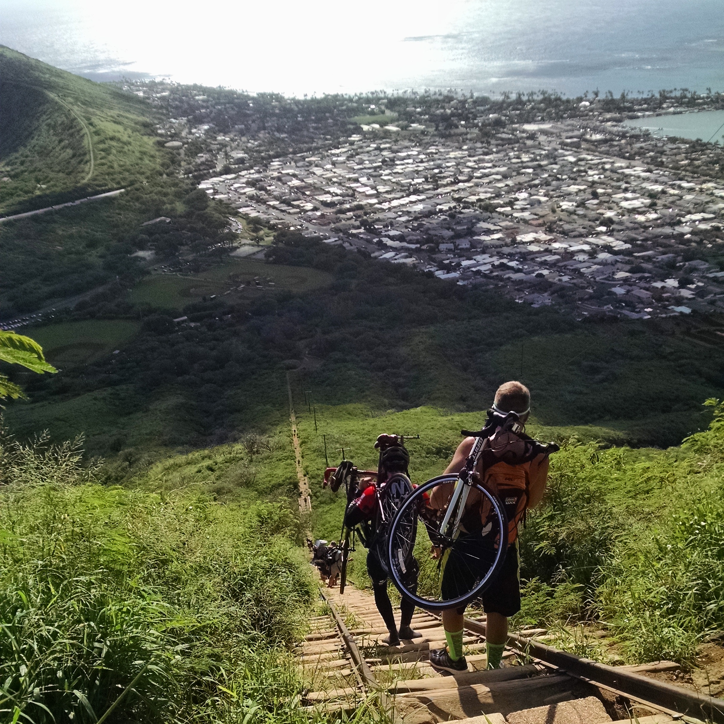 Julian told me he did the Honolulu Tinman, but he wasn’t doing this for training. If you could see that trail, you would be astonished at anyone getting a bike up there. If you have a rock hopper or a BMX or a trail bicycle, maybe, but these guys looked like they were on regular road bikes with regular tires.