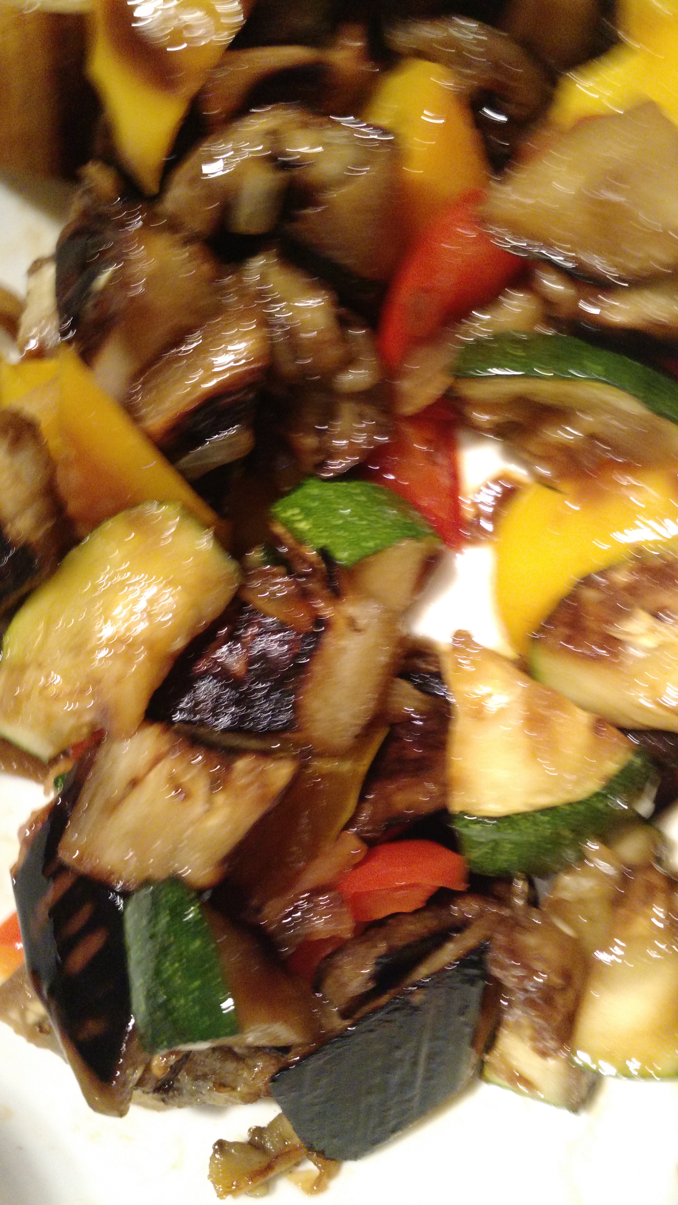 To the searing hot pan toss in the eggplant. Sprinkle with salt. Let them sit in the pan for 3-4 minutes until they brown on the bottom side and start to get tender. Swirl in some olive oil, swish the eggplant around in the pan until it’s at that great soft consistency. Remove to a bowl. Add the next vegetable. Sprinkle with salt. After the bell peppers cooked for about 4 minutes, I sprinkled more olive oil in the pan, threw in the zucchini chunks and let them sear for another 3-4 minutes with the peppers. Place in the bowl with the eggplant. Half or quarter the grape tomatoes and add them to the pan. Sprinkle with salt. After they start to melt a little and their skins start to brown, swish in more olive oil and add the shallots. Let the shallots soften and the tomatoes reduce further for another 4 minutes. Remove to the vegetable bowl. Let them cool a little.